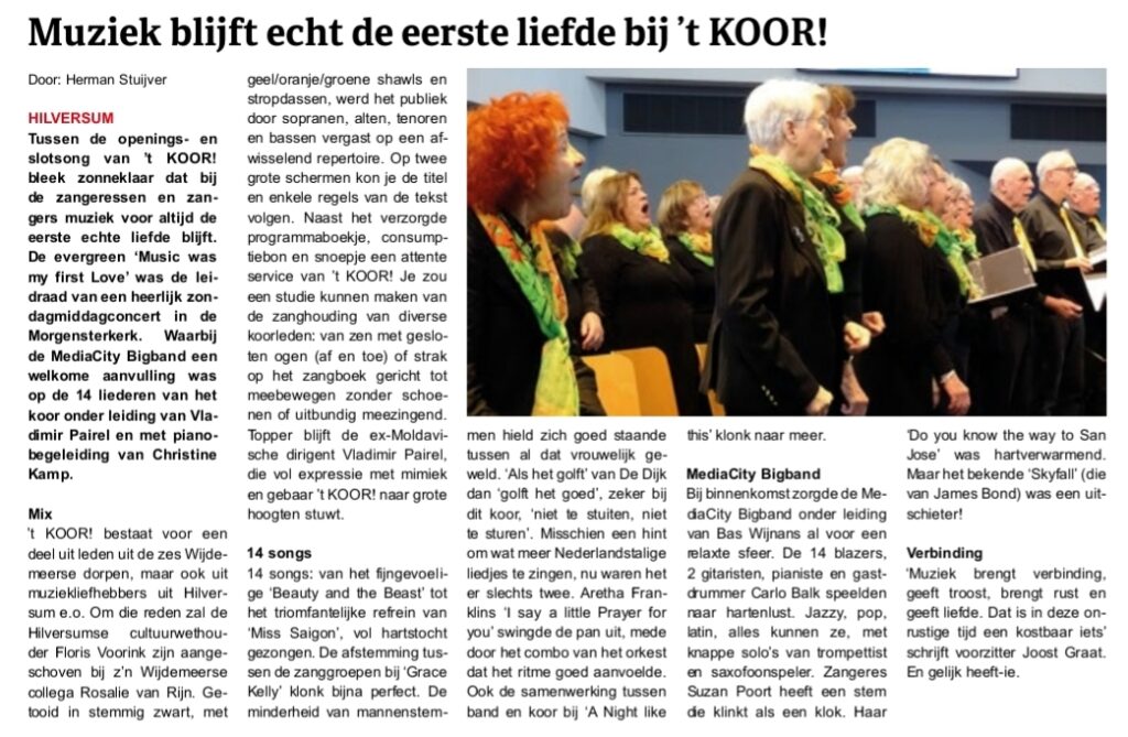 Wij zijn een gemengd koor (SATB) met ca. 45 leden uit de gemeente Wijdemeren, Hilversum en omliggende plaatsen. Ons repertoire bestaat uit musicial- en filmmuziek, evergreens en populaire muziek. Ook een klassiek stuk wordt niet geschuwd.